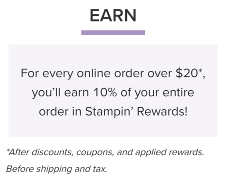 - Be sure to watch when you are getting close to that $20+ mark so you receive the 10% in Stampin’ Rewards directly from Stampin’ Up!. If your order is $19.99, or less, you will NOT earn Stampin’ Rewards at the time you place your order.